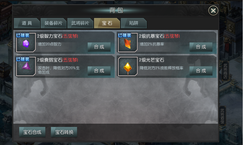 宝石:优先(生命,抗性,防御,圣神宝石)若出现释放技能属性较低的,预留一个位置可以核对你武将释放技能的属性是需求那个属性。