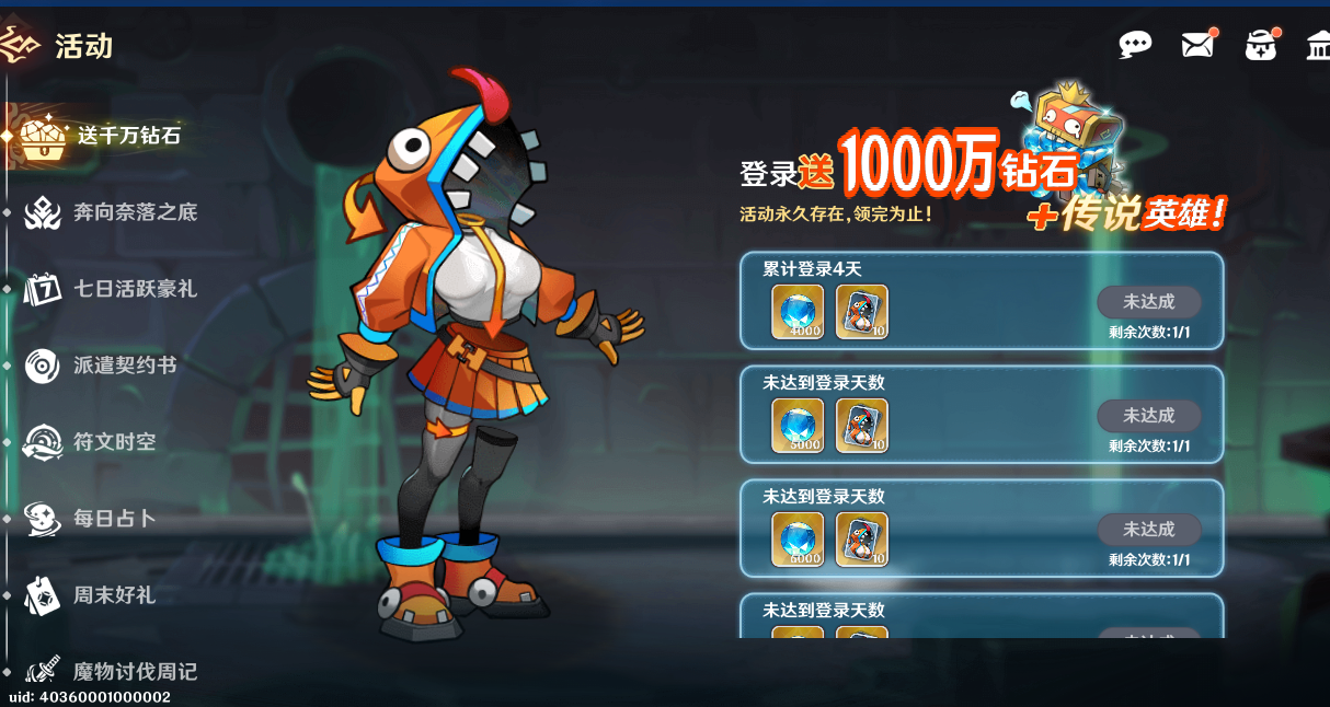 2、累计登录送千万钻石以及传说英雄更有七日活动送强力天才少女