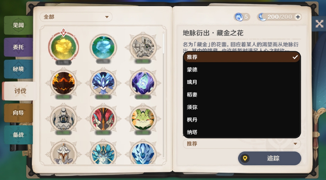 5、讨伐新增地脉花,选择地区后可一键追踪,同时新增查看目标首领特性/抗性/弱点的功能